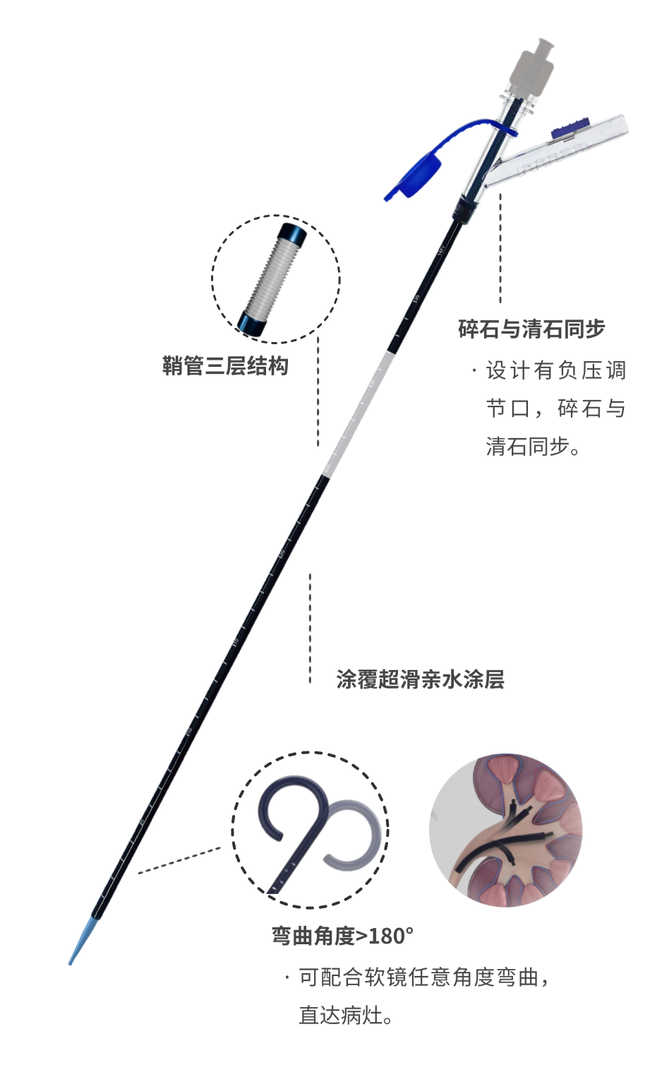設(shè)計有負(fù)壓調(diào)節(jié)口,碎石與清石同步,有效平衡腎內(nèi)壓,提高清石效率;